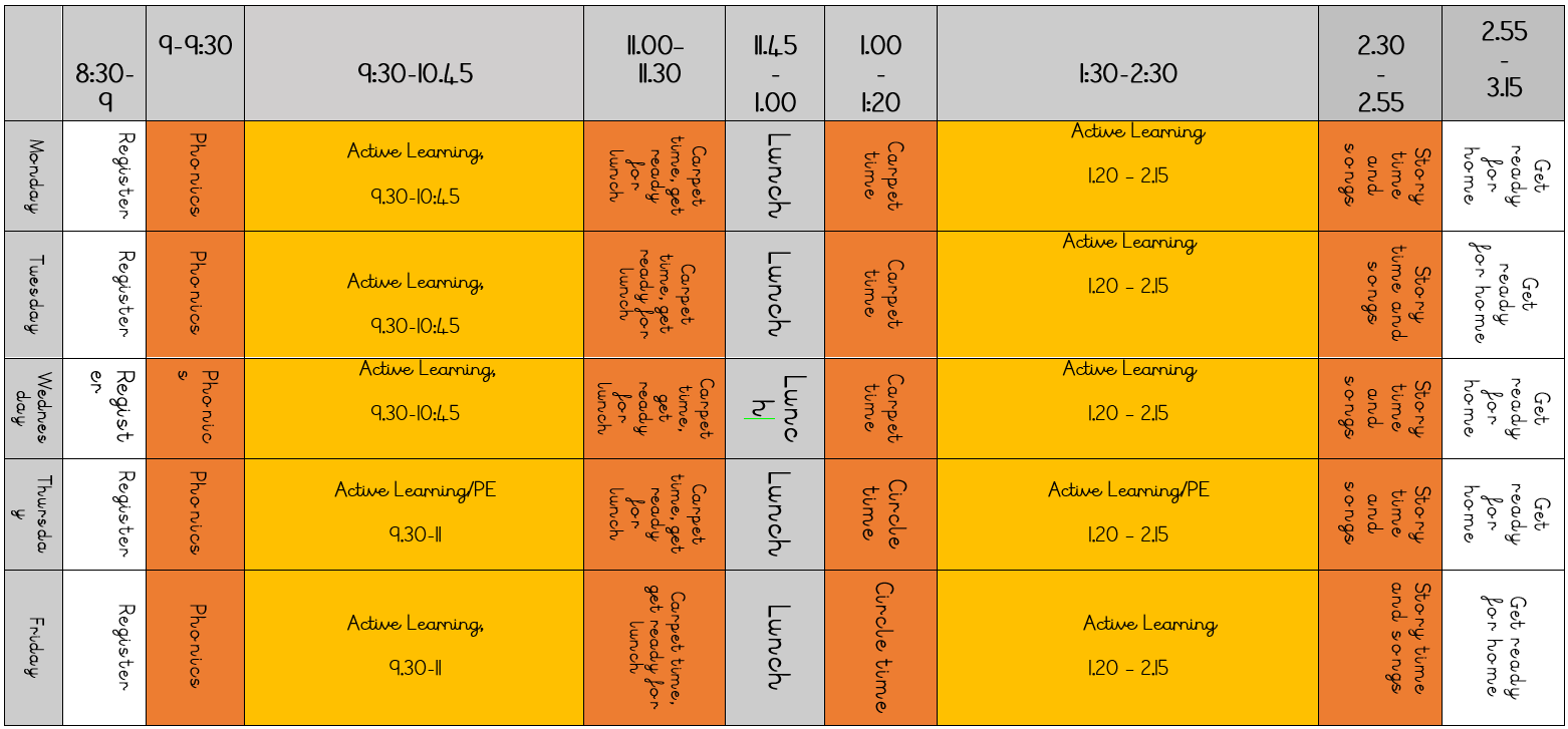 Homework will begin after October half term, this will be sending books home weekly linked to Read Write Inc. For now, please could adults at home share different stories with their children and practise writing their name.