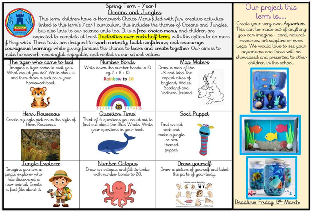 Year 1 will receive a ‘Homework Choice Menu’ filled with fun, creative activities linked to this term’s curriculum topic – Oceans and Jungles. It’s a free choice menu, and the children are expected to complete at least 3 activities over each half term, with the option to do more if they wish.